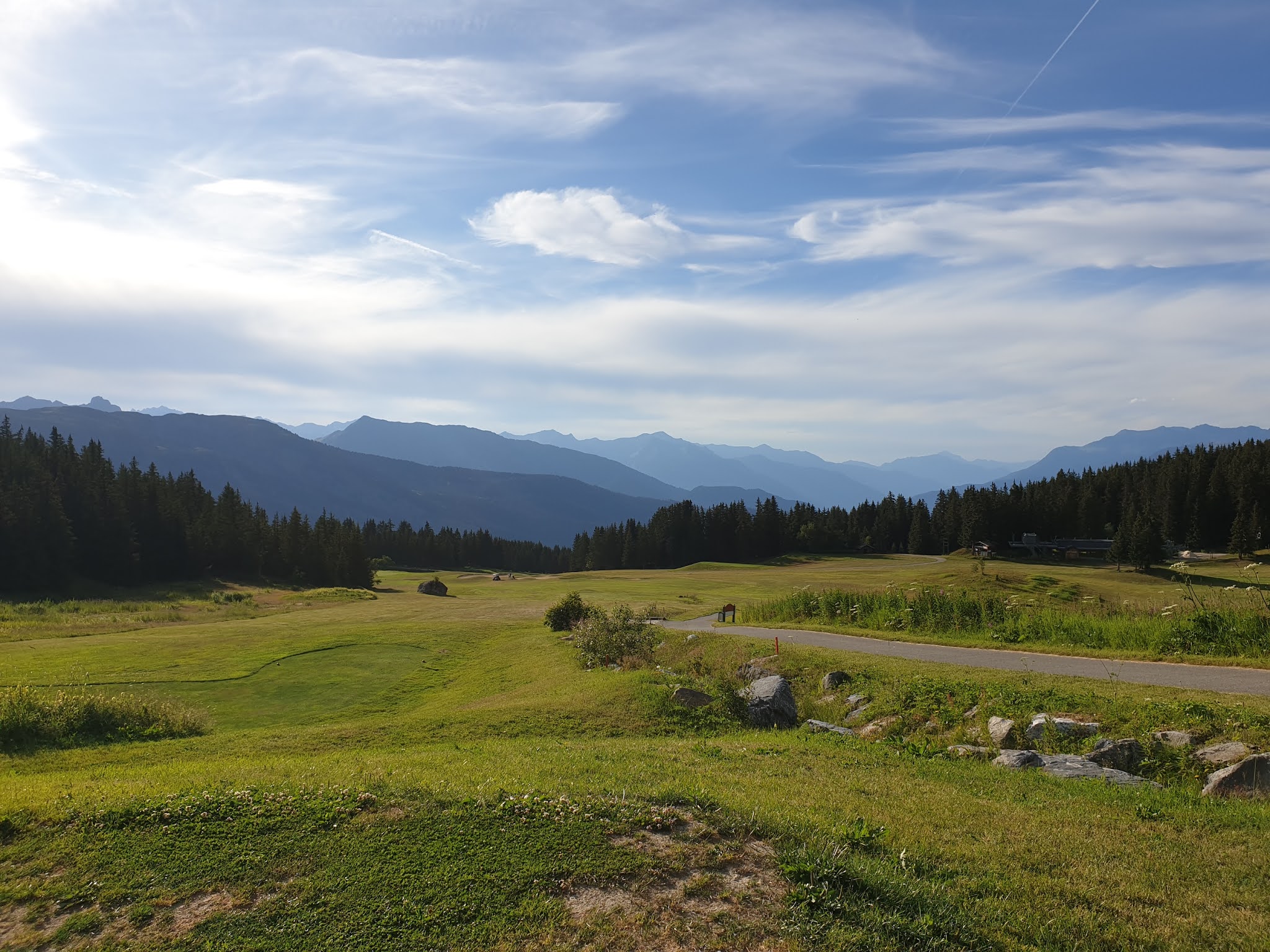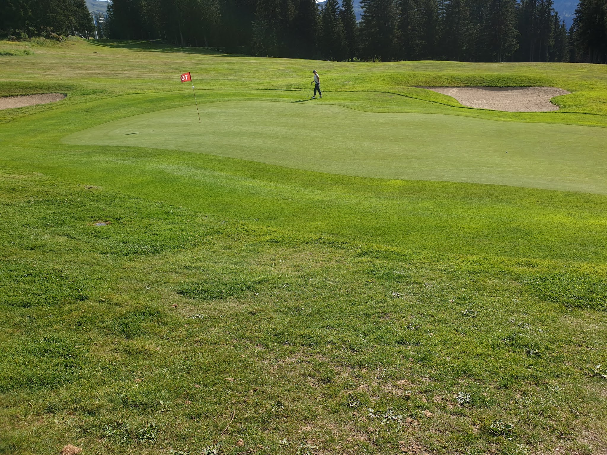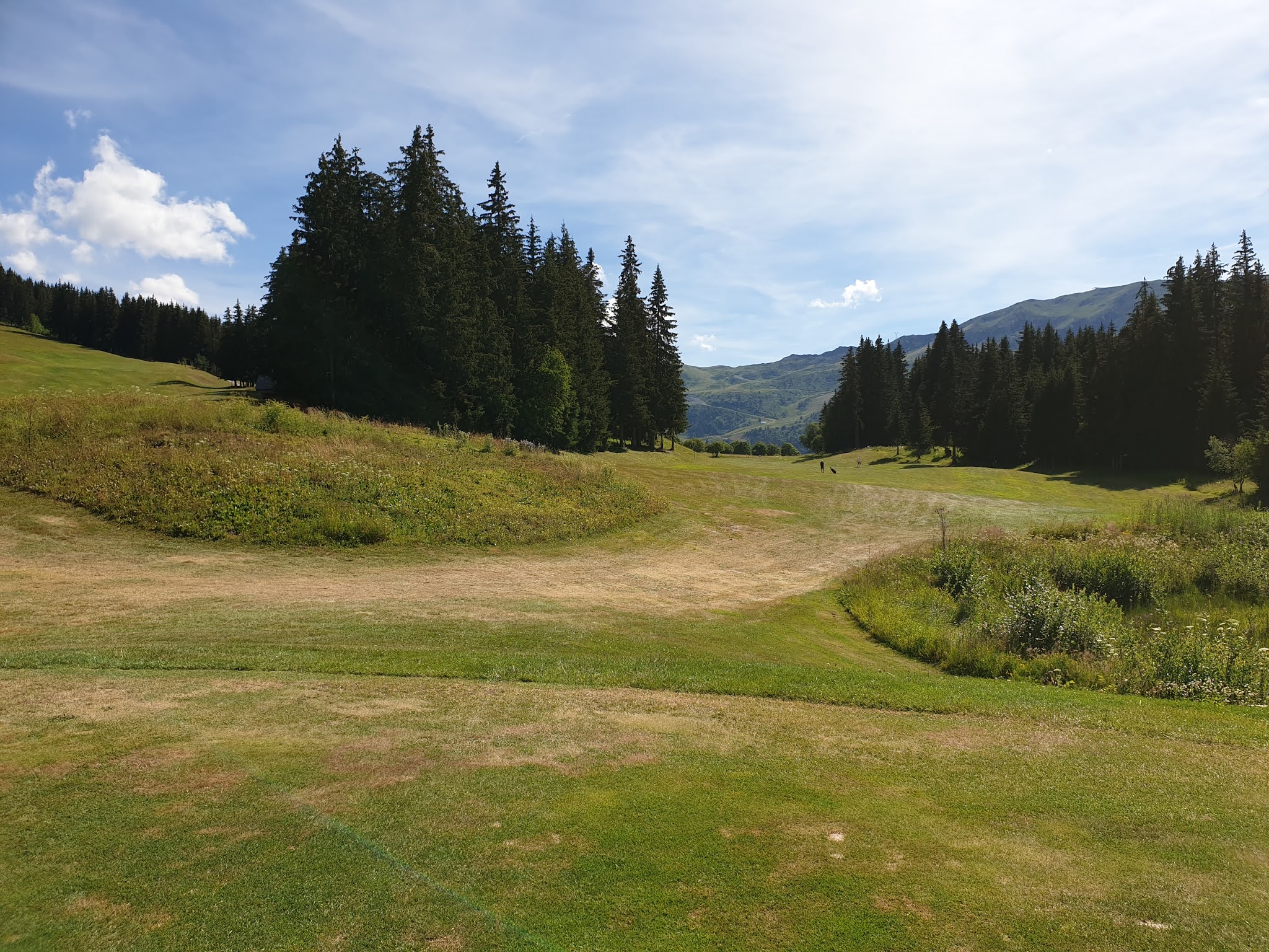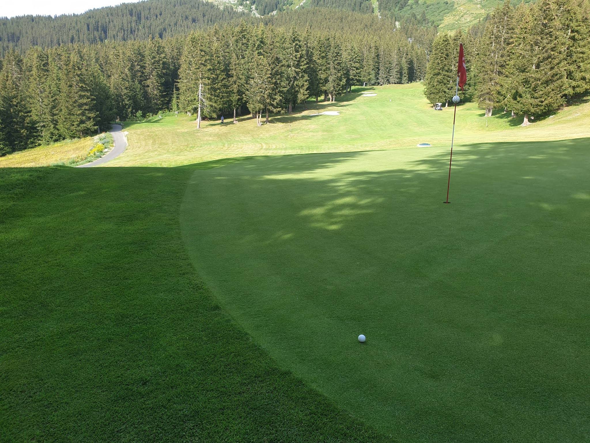 Quelle belle expérience ! Je le pensais difficile avec le relief et bien il n'en était rien. Soyons prudent et humble comme toujours devant cette petite balle blanche. Jouez en priorité des fers pour plus de précisions lorsque vous êtes entre les arbres et au retour lâchez vous ! Avec la voiturette, c'était du luxe, nous aurions pu le faire avec le sac sur le dos et du courage. Magnifique par cours, très vert en cette période estivale. Des greens et des départ de grande qualité. Enfin des pitchs relevés sur chaque green. En montagne il y a du relief et là on en a comme il faut jusqu'à vous obliger à faire un pause et contempler la vallée et les montagnes. Les balles gagnent quels mètres voire plus en raison de l'altitude. Dire que leur trou signature est le 9. A vrai dire, ils ont tous un point de vue remarquable. Et dire qu'en hiver la neige cache ce golf et que des milliers de skieurs passent dessus sans le savoir !