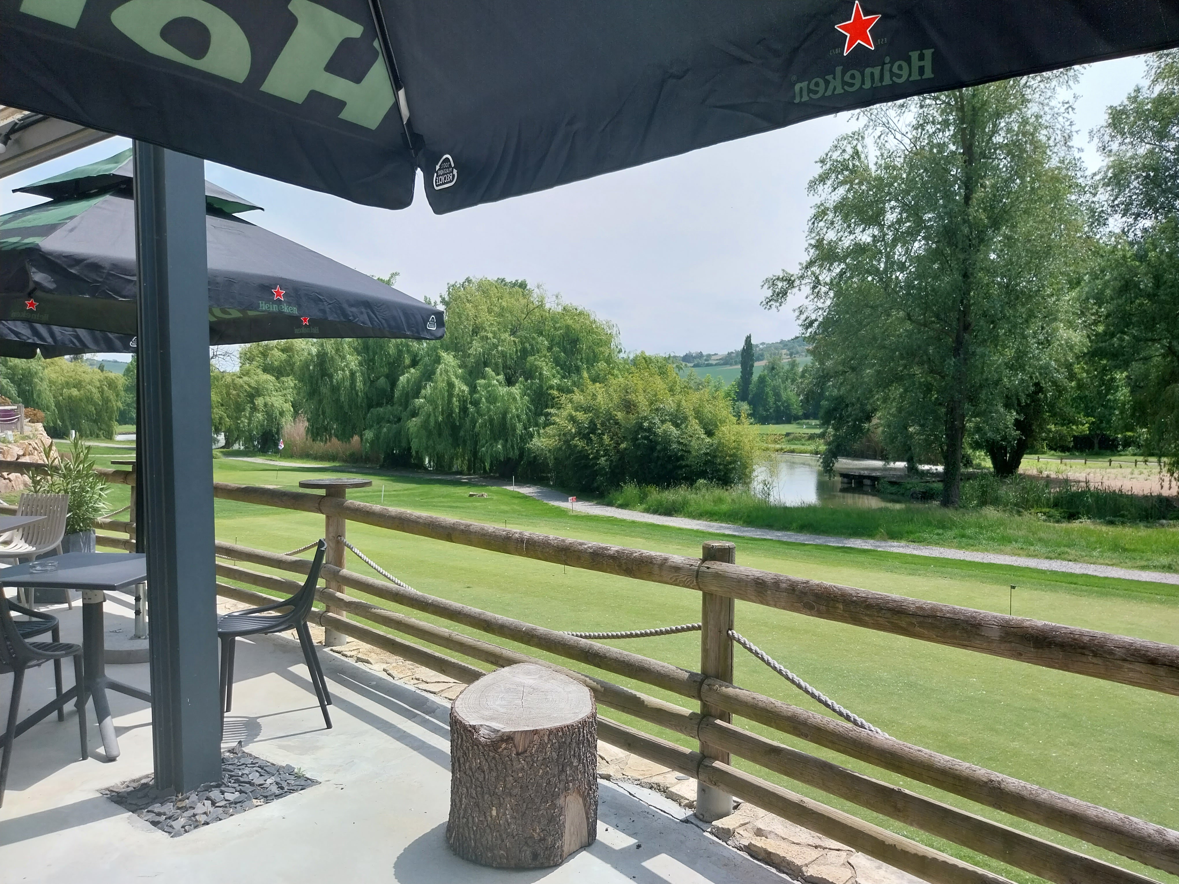 Vous pouvez déjeuner à la terrasse vu sur un le parcours et l'étang. Très bon rapport qualité prix avec un accueil chaleureux et le magnifique sourire d'Ariane. je recommande.